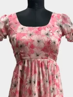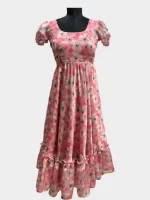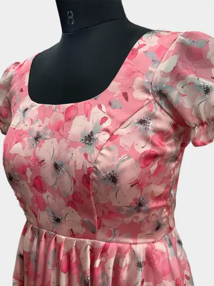 Floral Silk Frills Frock with Puff Sleeves and Back Zip